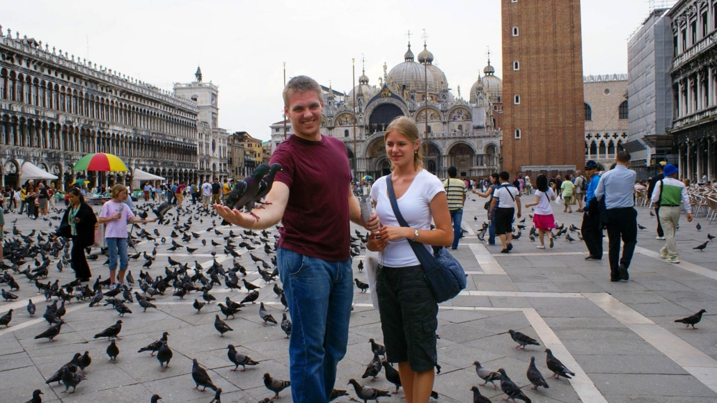 Feeding pigeons in Venice's St. Mark's Square during the 2007 Italy trip, with the Basilica and Campanile visible in the background